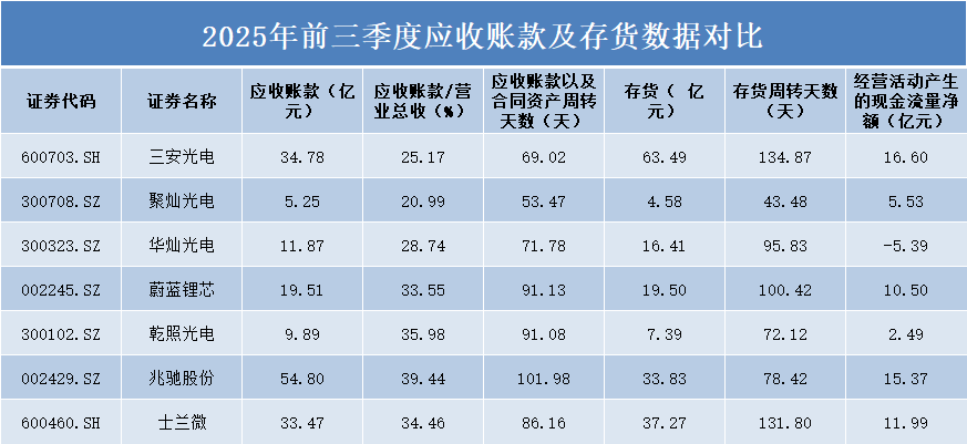 存貨方面,三安光電以63.49億元的存貨規模位居首位,其存貨周轉天數高達134.87天,面臨較大的庫存壓力。士蘭微存貨37.27億元,周轉天數131.8天,同樣存在庫存周轉較慢的問題。