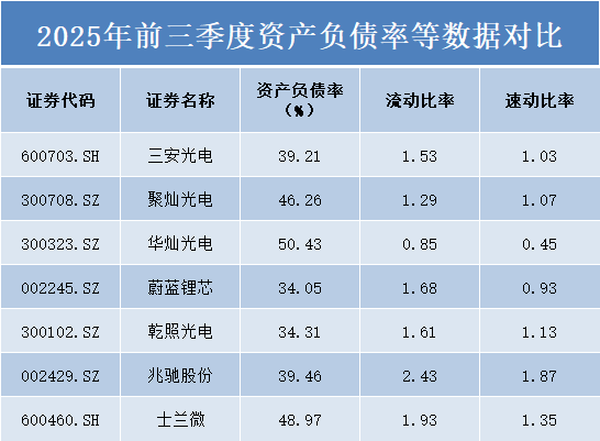 流動比率方面,兆馳股份以2.43的優異表現領先行業,士蘭微以1.93位列第二,顯示出較強的短期償債能力。蔚藍鋰芯、乾照光電和三安光電的流動比率分別為1.68、1.61和1.53,均高于1.5的行業安全水平。