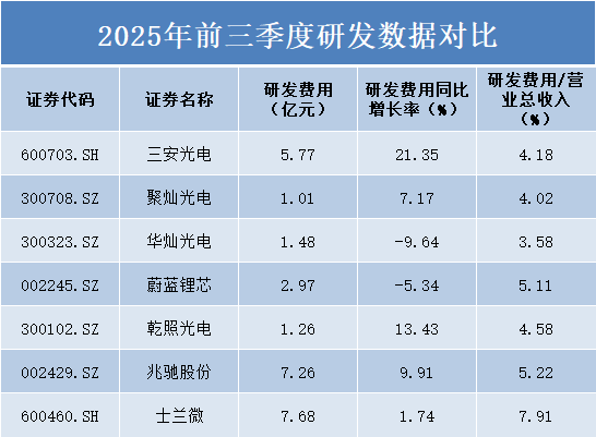 聚燦光電研發投入為1.01億元,是七家企業中唯一研發費用剛過億元門檻的公司,反映出不同規模企業在研發投入上的差異。