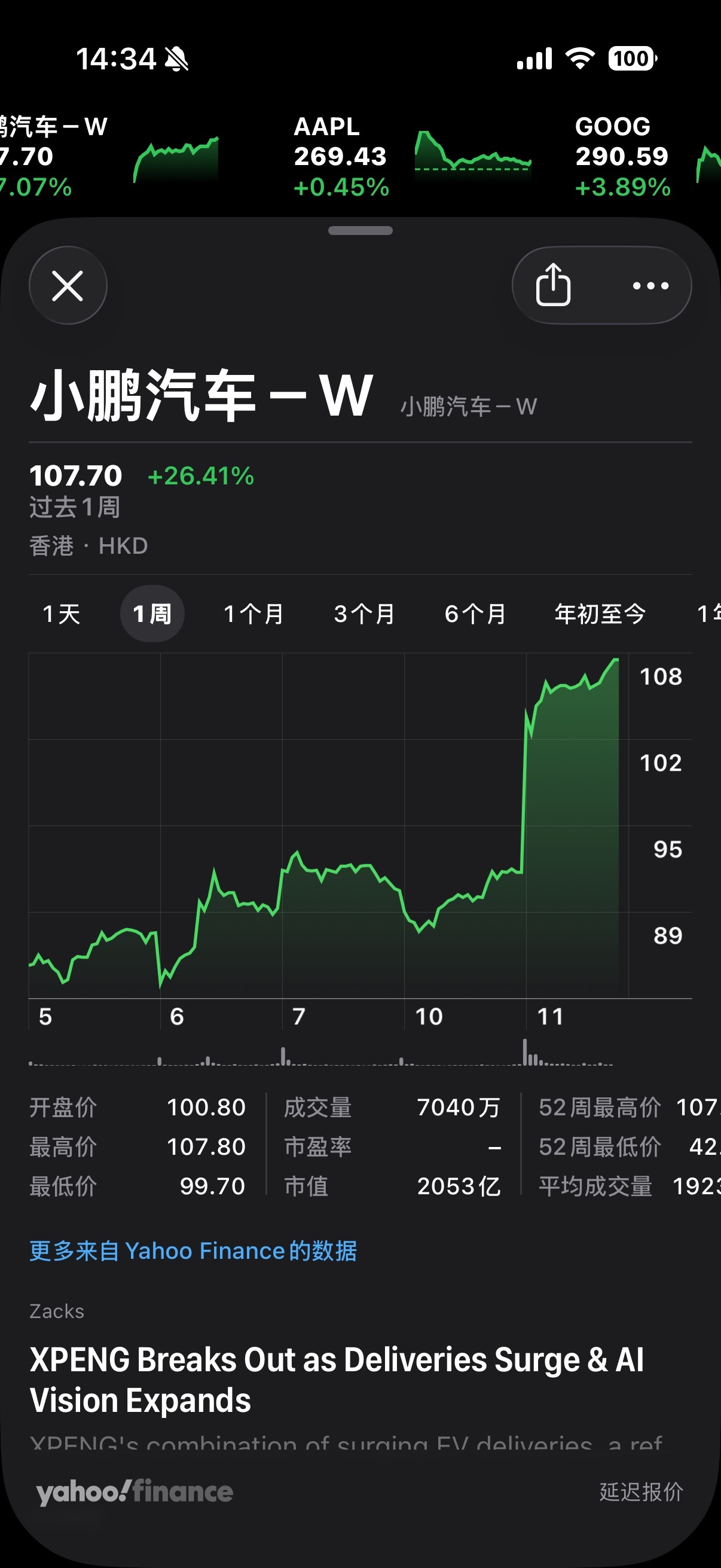 11月11日,截至發(fā)稿,小鵬汽車港股上漲16.74%,報(bào)107.4港元;美股昨日收盤漲16.15%,盤后又上漲1.31%,報(bào)26.04美元。受對其機(jī)器人的樂觀情緒提振,過去一周,小鵬汽車?yán)蹪q26.41%。