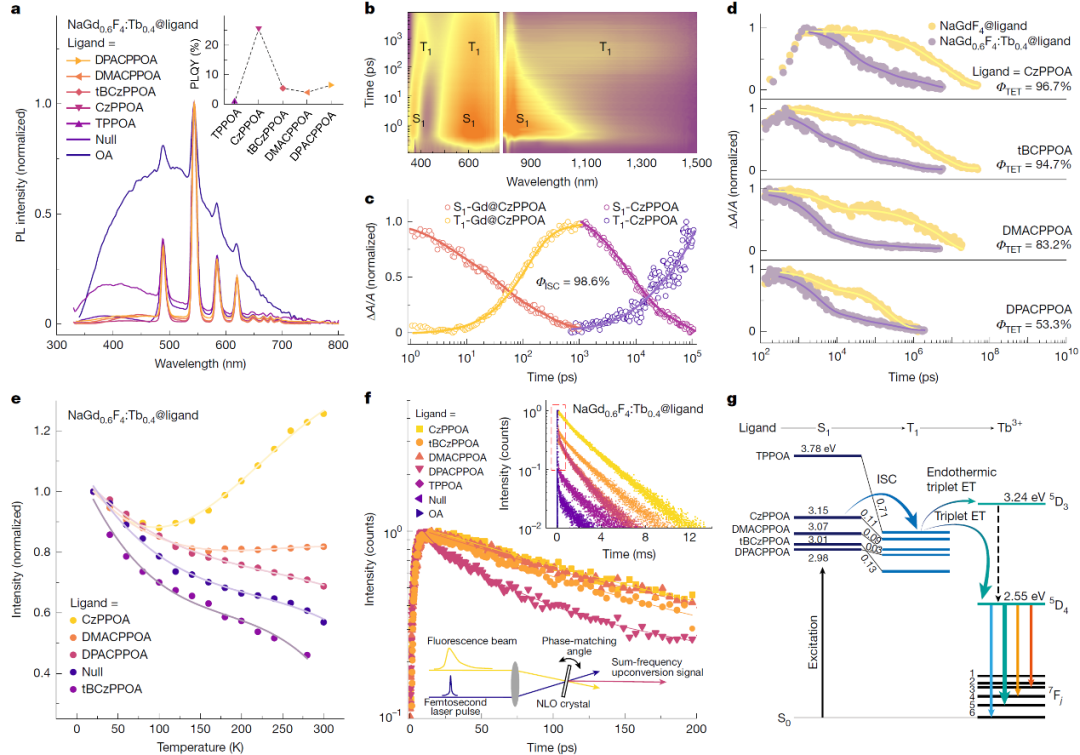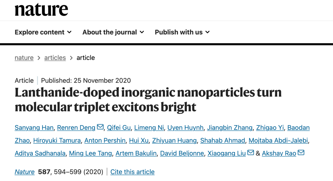 2020年,韓三陽以第一作者身份發(fā)表《自然》文章,展示團(tuán)隊(duì)研究成果:利用鑭系納米晶與界面分子進(jìn)行結(jié)合,可實(shí)現(xiàn)三線態(tài)激子的自旋調(diào)控以及快速將激子能量注入稀土納米顆粒。