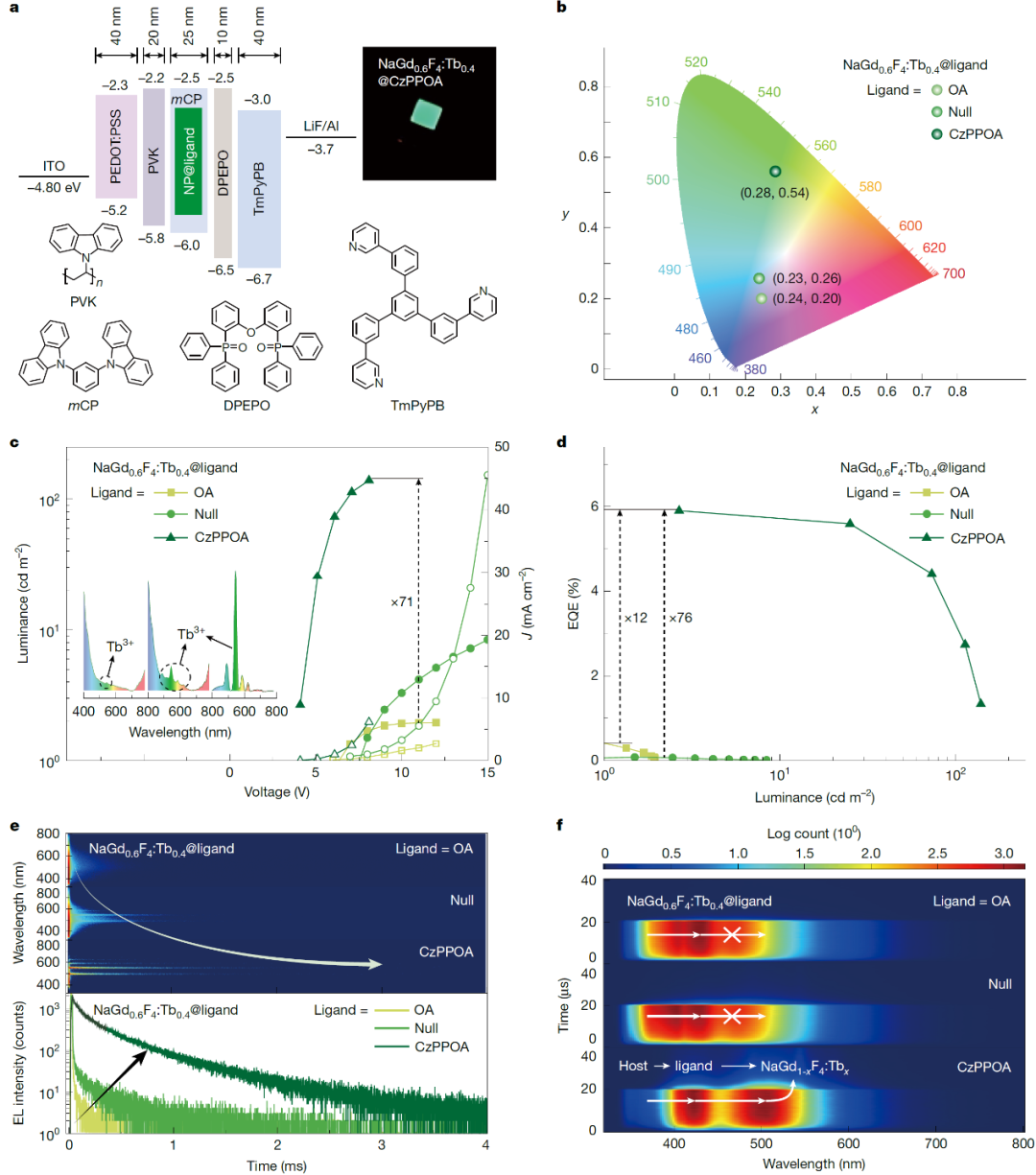 針對(duì)上述難題,韓三陽副教授團(tuán)隊(duì)與黑龍江大學(xué)許輝、韓春苗教授團(tuán)隊(duì)和新加坡國立大學(xué)劉小鋼院士團(tuán)隊(duì)聯(lián)合攻關(guān),通過表面修飾為鑭系摻雜納米晶穿上“能量轉(zhuǎn)換外衣”,采用有機(jī)-無機(jī)雜化策略,精確調(diào)控能級(jí)結(jié)構(gòu),借助配體工程將激子能量高效分配給鑭系離子發(fā)光體,成功解決了電致發(fā)光中激子產(chǎn)生、輸運(yùn)和注入的核心難題,實(shí)現(xiàn)了高色純度、光譜可調(diào)的高效電致發(fā)光。