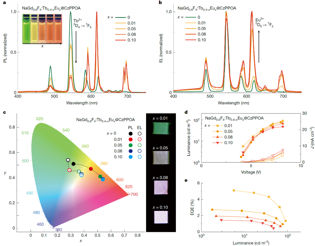 稀土納米晶(鑭系摻雜納米晶),具有發(fā)光顏色可調(diào)、發(fā)光譜線窄、發(fā)光穩(wěn)定性高等先天優(yōu)勢,一直被視為電致發(fā)光材料的“潛力股”。