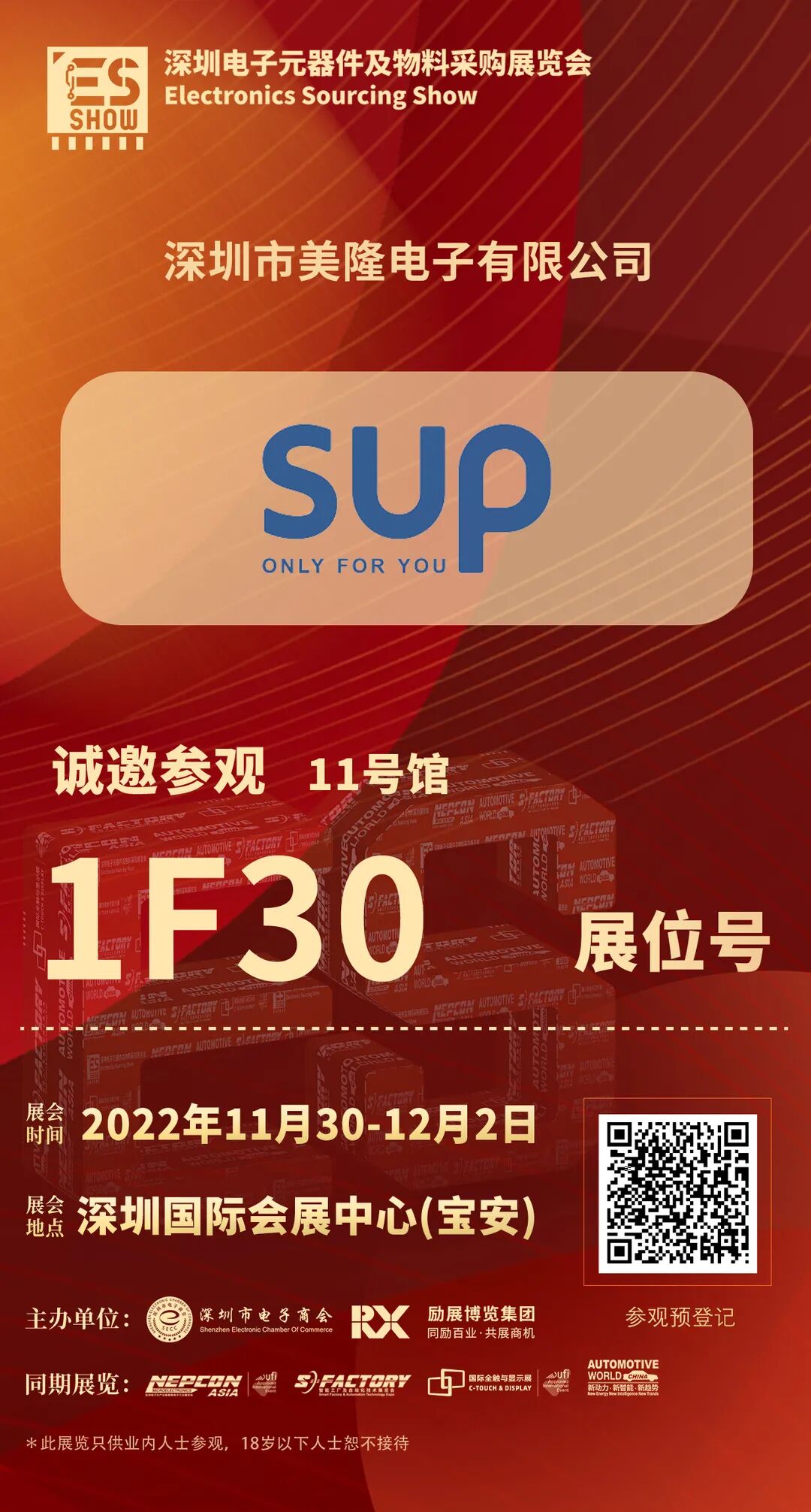 2022 深圳電子元器件及物料采購展覽會,將于11月30日-12月2日在深圳國際會展中心(寶安)閃亮登場,隆重開幕。深圳市美隆電子有限公司期待您的到來,11號館1F30展位,趕緊收下此邀請函,碼上登記,我們不見不散!