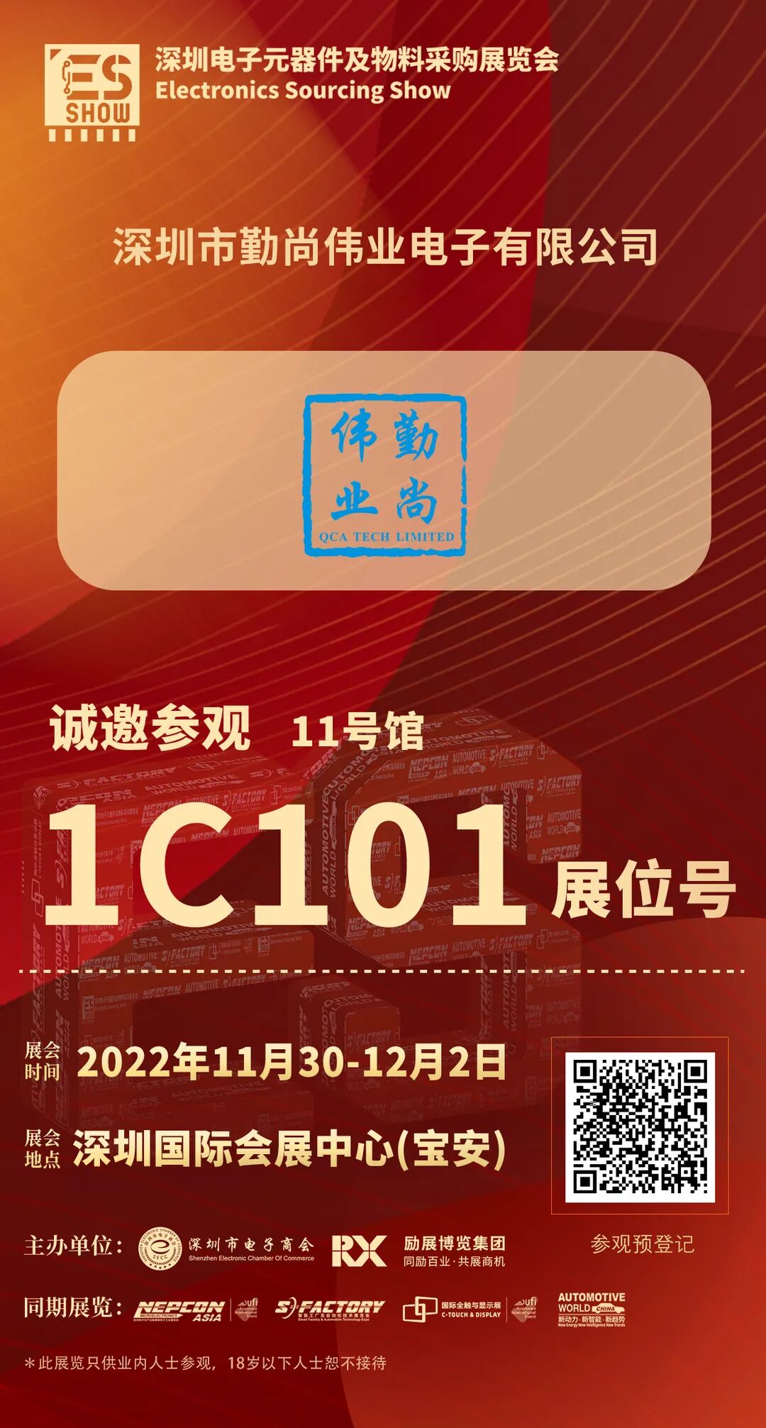 2022 深圳電子元器件及物料采購展覽會,將于11月30-12月2日在深圳國際會展中心(寶安)閃亮登場,隆重開幕。深圳市勤尚偉業電子有限公司期待您的到來,11號館1C101 展位,趕緊收下此邀請函,碼上登記,我們不見不散!