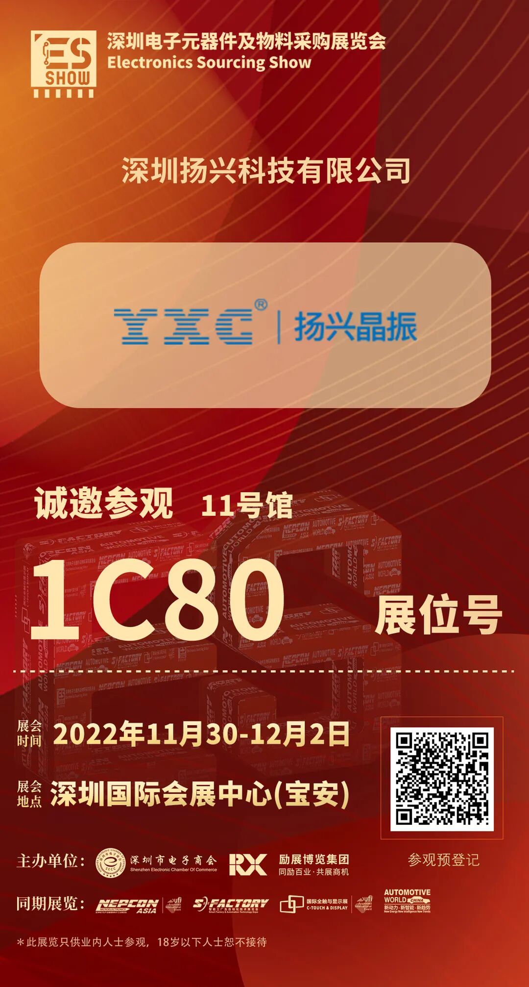 2022 深圳電子元器件及物料采購(gòu)展覽會(huì),將于11月30日-12月2日在深圳國(guó)際會(huì)展中心(寶安)閃亮登場(chǎng),隆重開(kāi)幕。深圳揚(yáng)興科技有限公司期待您的到來(lái),11號(hào)館1C80展位,趕緊收下此邀請(qǐng)函,碼上登記,我們不見(jiàn)不散!