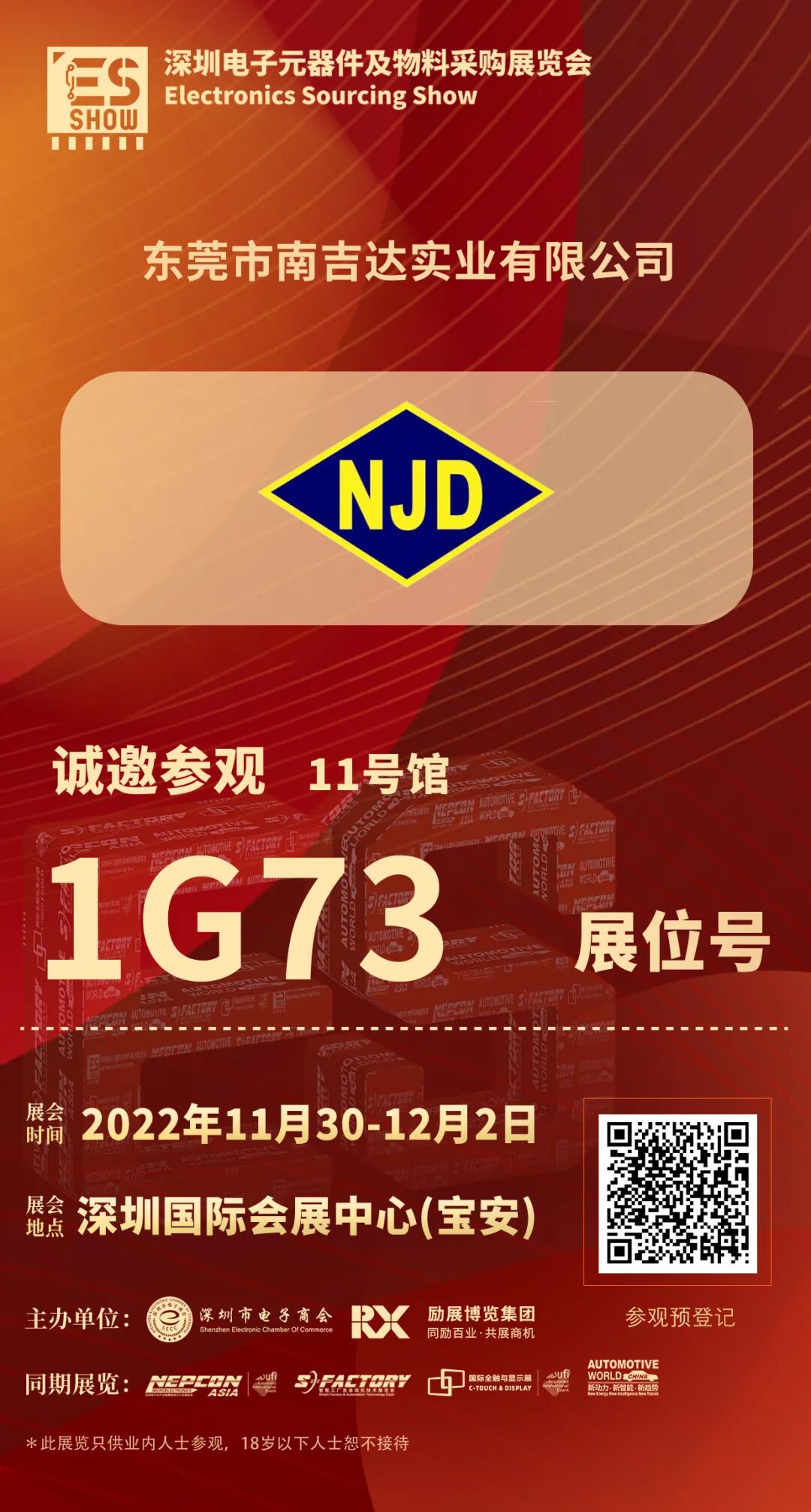 2022 深圳電子元器件及物料采購展覽會,將于11月30日-12月2日在深圳國際會展中心(寶安)閃亮登場,隆重開幕。東莞市南吉達實業有限公司期待您的到來,11號館1G73展位,趕緊收下此邀請函,碼上登記,我們不見不散!