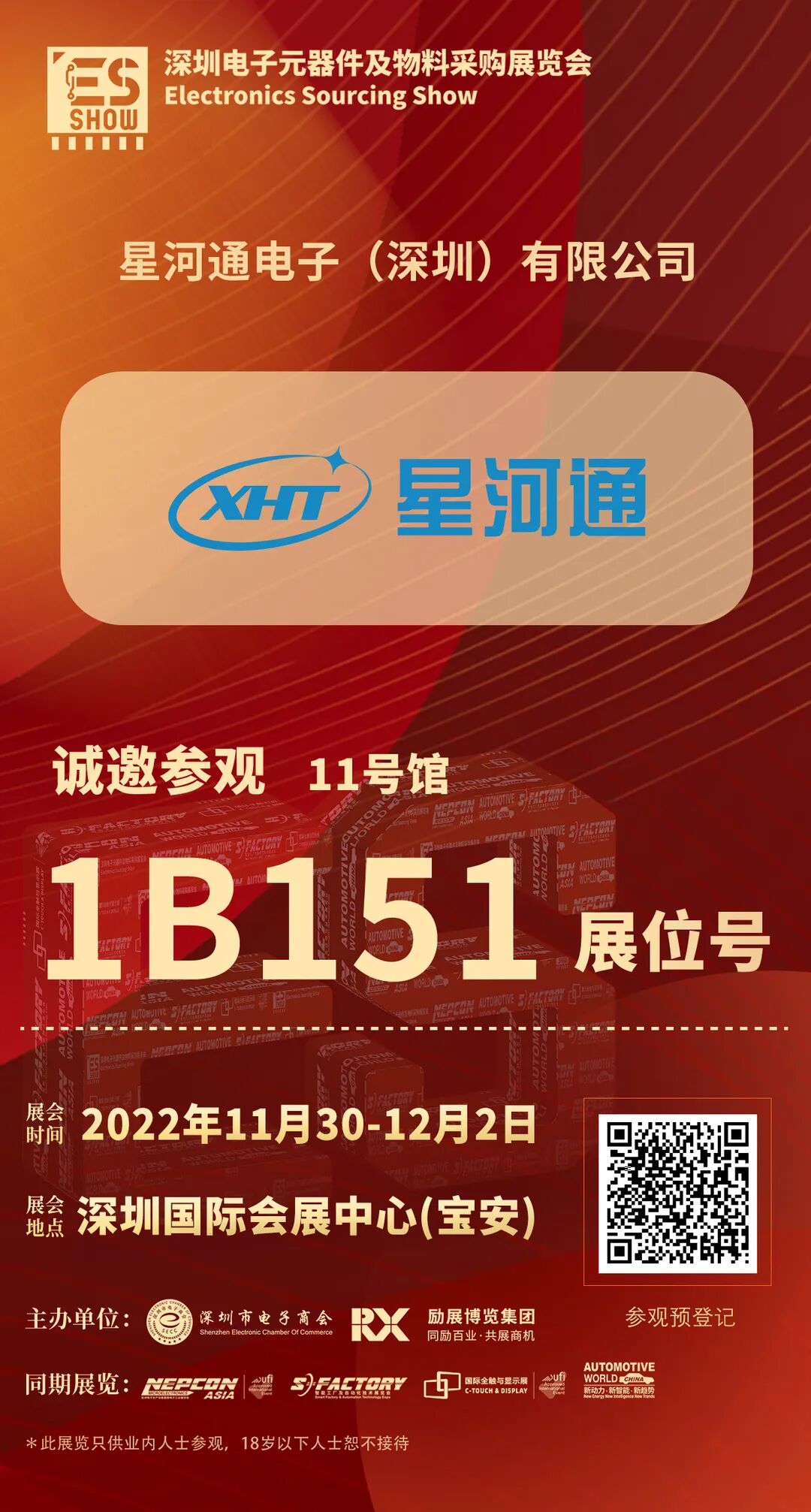 2022 深圳電子元器件及物料采購展覽會,將于11月30日-12月2日在深圳國際會展中心(寶安)閃亮登場,隆重開幕。星河通電子(深圳)有限公司期待您的到來,11號館1B151展位,趕緊收下此邀請函,碼上登記,我們不見不散!