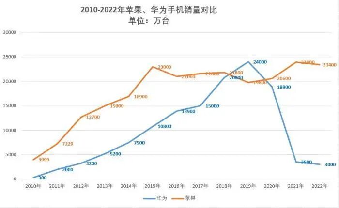 我再上一張圖,這是華為、蘋果從2010年開始,直到2022年的銷量對比圖,這兩張圖一對比,估計大家就看的比較明月了。