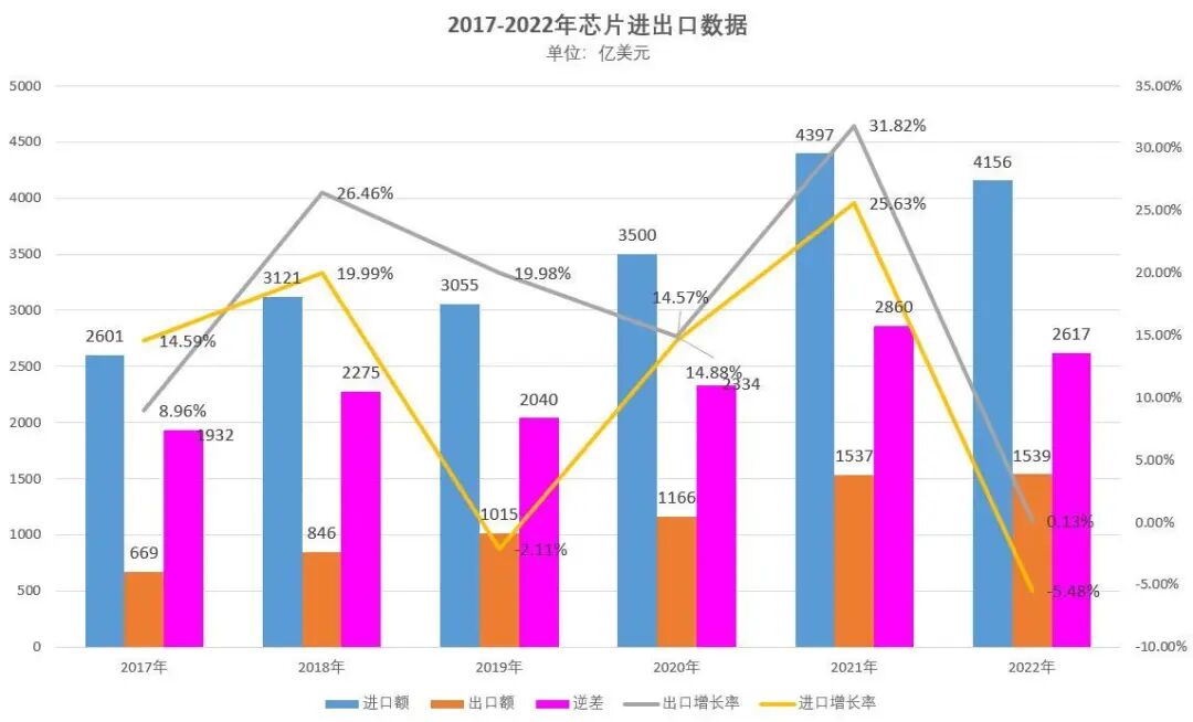 2022年,中國(guó)進(jìn)口芯片5384億件,較2021年減少15%,約減少了970億件。而進(jìn)口金額為4156億美元,同比減少了241億美元,這也是10多年以來,進(jìn)口減少最多的一次。
