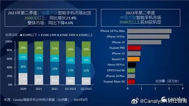 如上圖所示,2季度中國(guó)最暢銷(xiāo)的10大手機(jī)分別是iPhone 14 Pro Max、iPhone 14 Pro、iPhone 14、華為P60、iPhone 13、小米13、榮耀90 Pro、OPPO Find X6、iPhone 14 Plus、華為Mate 50。