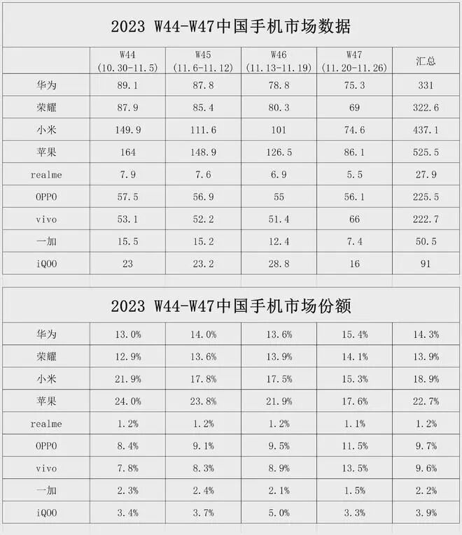 接著是小米,排名第二,在第44周至46周這三周,均是排名第二名,只在第47周這一周時,以微弱的劣勢,低于華為,但總體市場份額高達18.9%,僅次于蘋果。